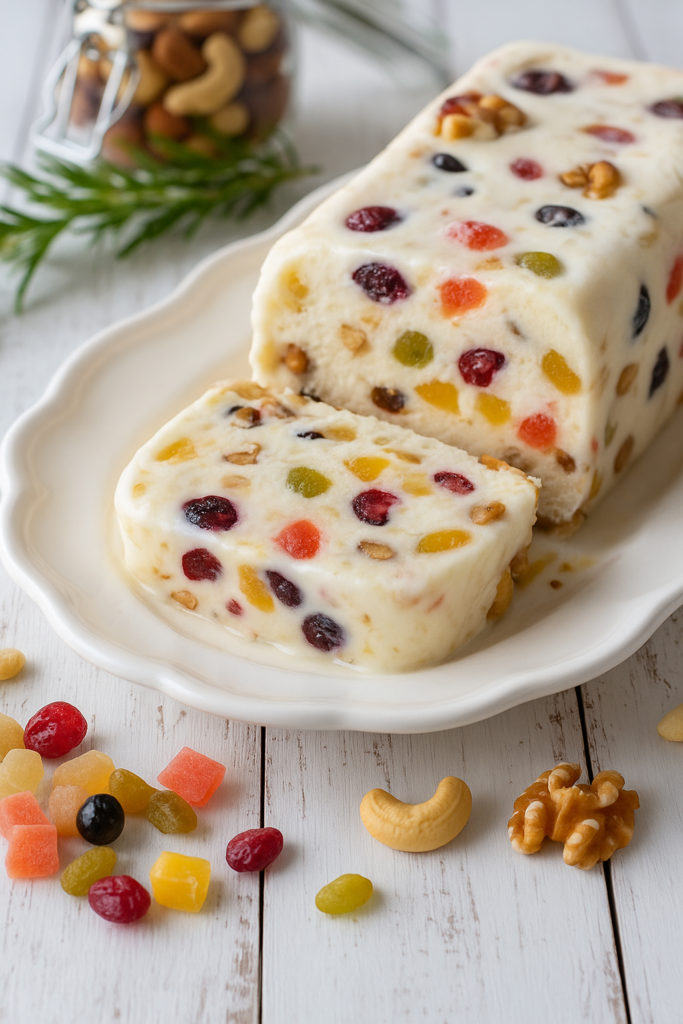 ドライフルーツとナッツを散らすように加える。 - 型に流し入れて冷やす